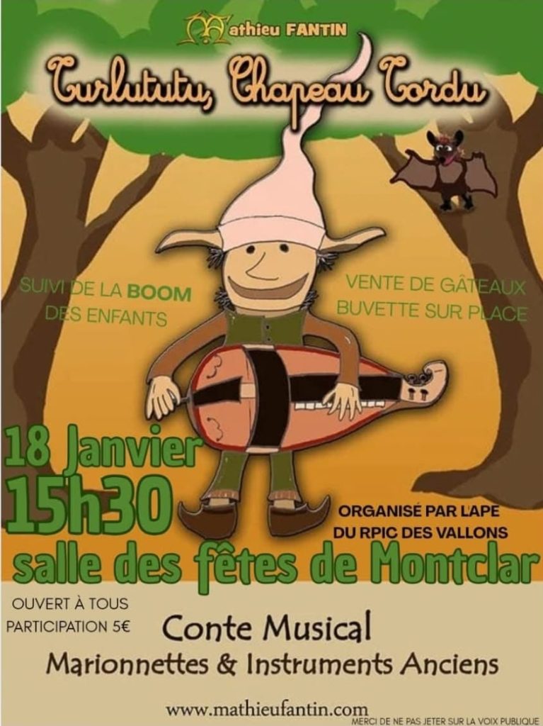 Montclar : Le Dimanche 18 Janvier 2026, à la Salle des Fêtes, à 15h30 : Conte Musical pour enfants « Turlututu,chapeau tordu ».