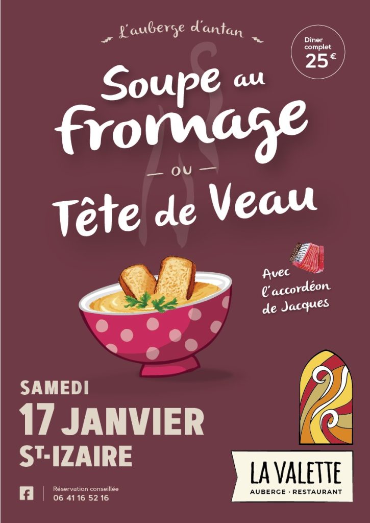 St-Izaire: Le Samedi 17 Janvier 2026, à la Valette : Repas animé (Soupe au fromage/tête de veau).