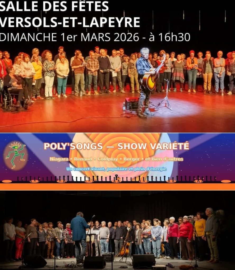 Versols-et-Lapeyre : Le Dimanche 1°Mars 2026, à la Salle des Fêtes, à 16h30 : Chorale Polysongs-show variété.