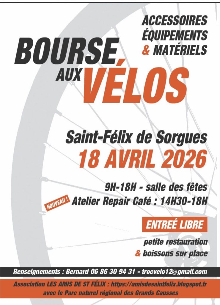 St-Félix-de-Sorgues :Le Samedi 18 Avril 2026,à la Salle des Fêtes, de 9h00 à 18h00 : Bourse aux vélos.